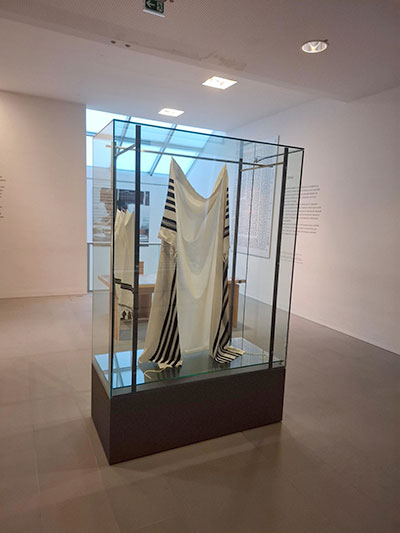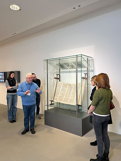 Im Museum wurden zudem Grundzüge jüdischer Religion und Tradition anschaulich erläutert: die Bedeutung der hebräischen Bibel (Tanach), der Tora als Kerntext sowie der mündlichen Überlieferung, die später im Talmud verschriftlicht wurde. Auch die Rolle des Schabbats als wöchentlicher Ruhe- und Feiertag, die Speisevorschriften (Kaschrut) und der Stellenwert von Erinnern und Gedenken in jüdischen Familien und Gemeinden kamen zur Sprache. Dr. Bartsch erläuterte daneben Traditionen und religiöses Leben der heutigen Gemeinde, deren Mittelpunkt seit 2006 das Shalom Europa mit seiner 1966–1970 erbauten Synagoge ist. In diesem Zusammenhang wurde auch die Architektur der Synagoge als Ausdruck religiöser Praxis beschrieben – etwa die zentrale Stellung des Lesepults (Bima) und die besondere Bedeutung des Raums für Gebet, Gemeinschaft und religiöse Rituale.